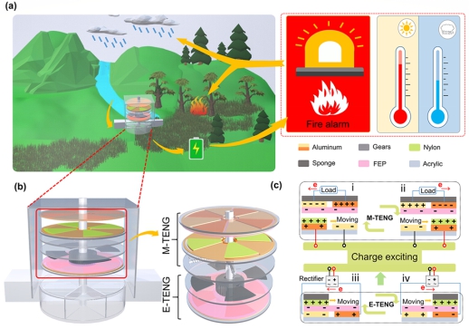 该工作通过电荷激励的方式有效地提高了TENG的电输出性能,相对于普通的滑动TENG,其电输出性能提升了2.6倍。并且通过离心力驱动层和齿轮系统的巧妙设计,实现了主TENG(M-TENG)工作模式的自动接触-分离和激励TENG(E-TENG)的转速调整,有效地降低了TENG在中高频区的滑动摩擦损耗问题,提升了TENG的工作耐久性。在连续工作72,000次循环后,还能维持94%的电输出性能,而普通的旋转滑动模式TENG的电输出性能衰减到了30%。本工作同时有效地提高了TENG的电输出性能和其耐久性,并通过水轮设计成功将水流的机械能转化为电能为多种商业器件供电,为智能森林环境的自供电监测电源提供了一种理想的方案,拓展了物联网自供电系统在偏远地区的应用。