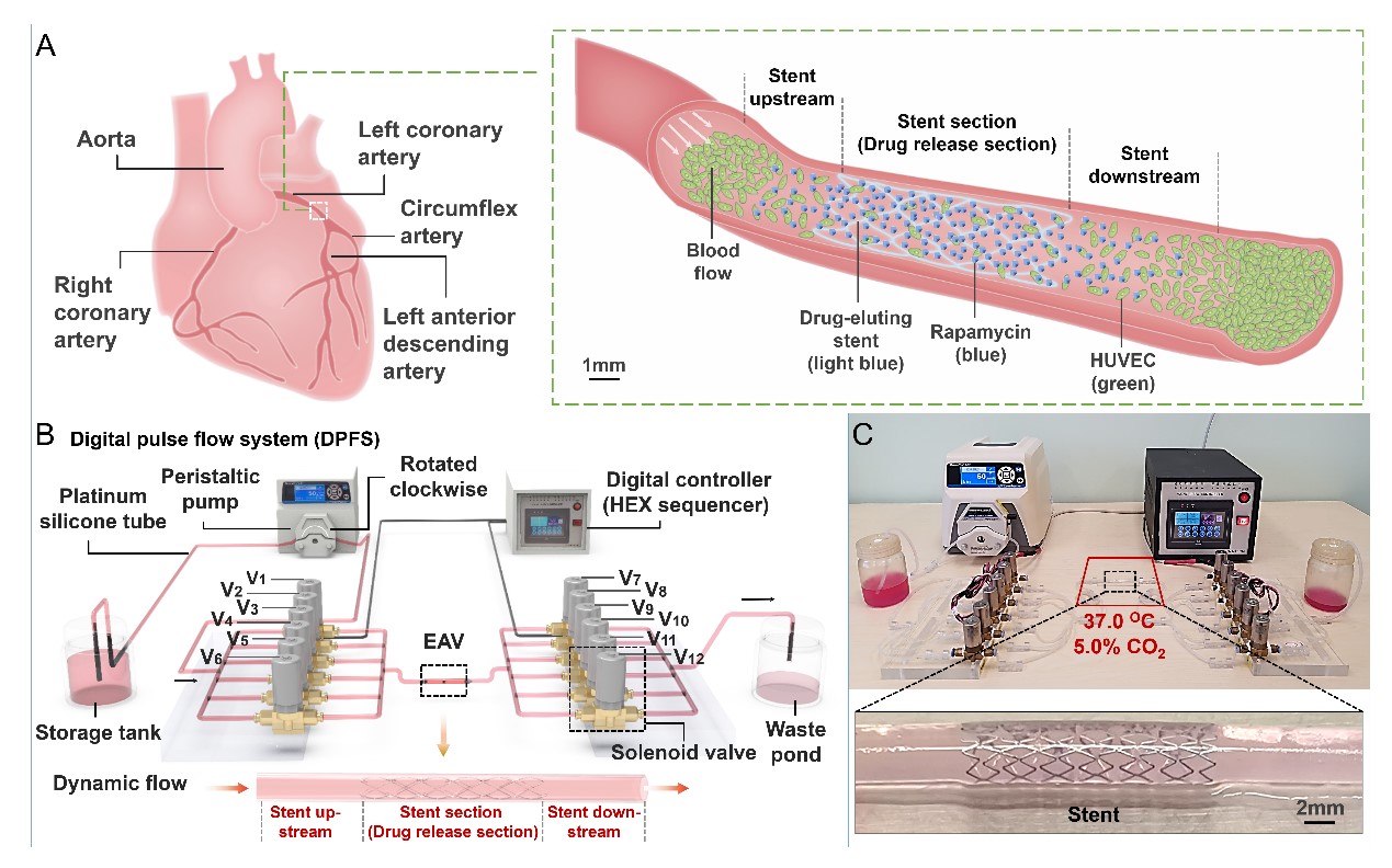 刘雳宇教授与首都医科大学附属北京安贞医院彭红玉、重庆海吉亚肿瘤医院张鸿飞课题组等合作,在体外构建了基于数字脉冲系统和弹性类血管模型的一体化实验平台,可用于评估支架类型对心血管狭窄病变术后的二次狭窄与血管痉挛风险。该研究工作发表于微流控领域顶级期刊《Lab on a chip》,司机社