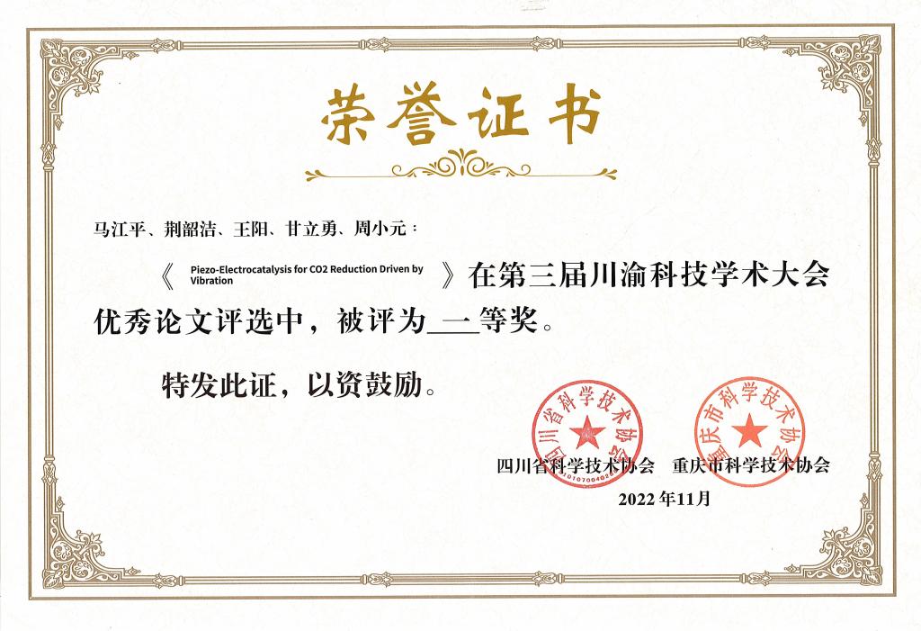 20221123日,由四川省科学技术协会、重庆市科学技术协会联合举办的第三届川渝科学技术大会在成都举行本届大会主题为潜心学术研究 引领科技创新。开幕式上,大会公布了年度川渝最具影响力学术活动、年度川渝一流学会、年度川渝一流科技期刊以及第三届川渝科技学术大会优秀论文获奖名单。我院周小元教授团队发表的论文《Piezo-electrocatalysis for CO2 Reduction Driven by Vibration》荣获第三届川渝科技学术大会优秀论文一等奖。