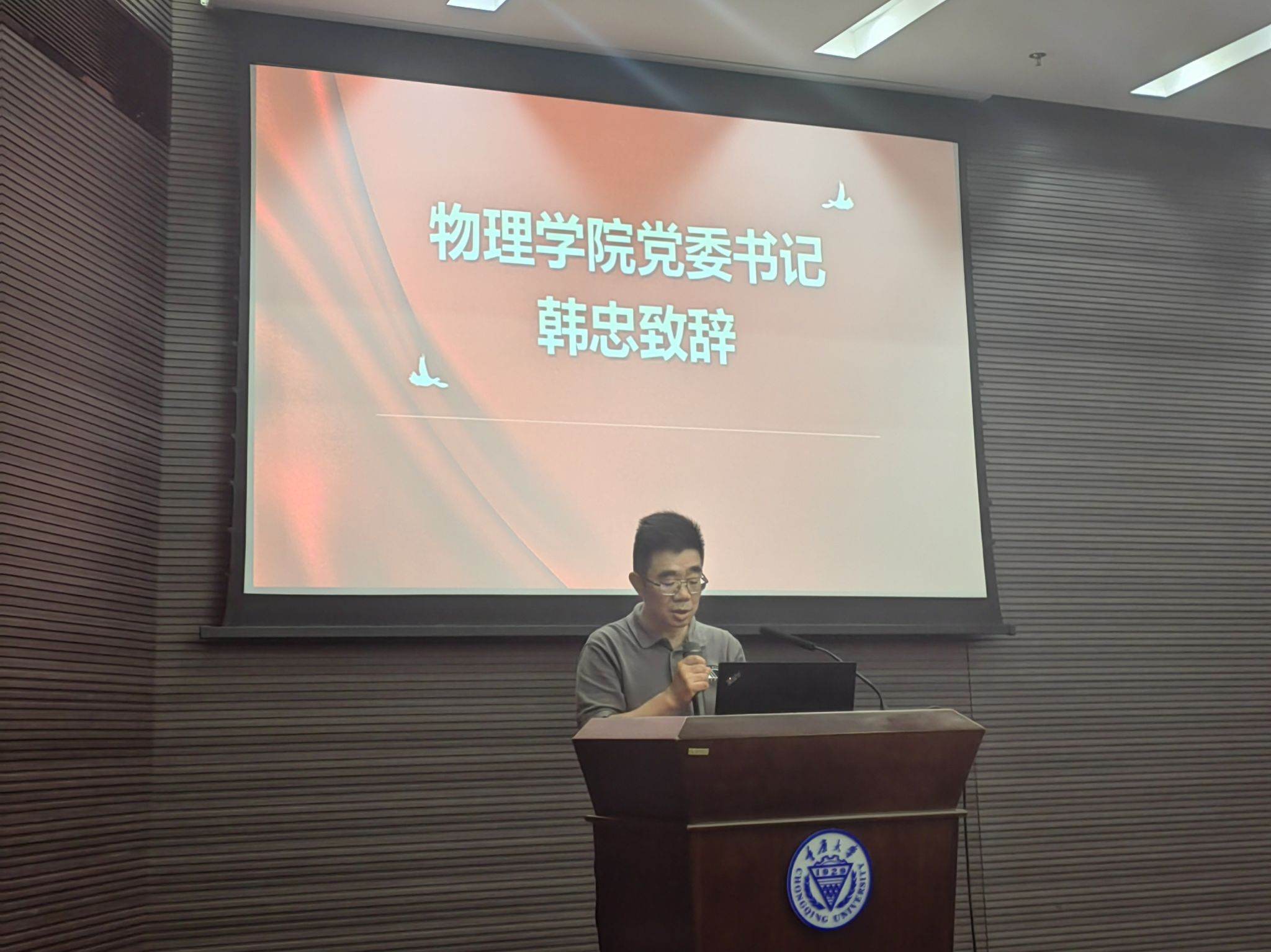 韩忠向新生致辞,首先他对于大家的到来表示热烈的欢迎,然后鼓励同学们坚持学习练好本领为后续发展打下坚实的基础。最后,韩忠向同学们提出了三点希望:一是在大学里要坚持锻炼,拥有强健的体魄、阳光的心态,保持身心健康;二是在大学里要不断的努力和实践,拥有更高层次的思考,更好地迎接未知的挑战与机遇;三是在大学里要有对科学的执着追求和无穷的探索精神,扛起时代的担当,争做优秀的重大物理人。