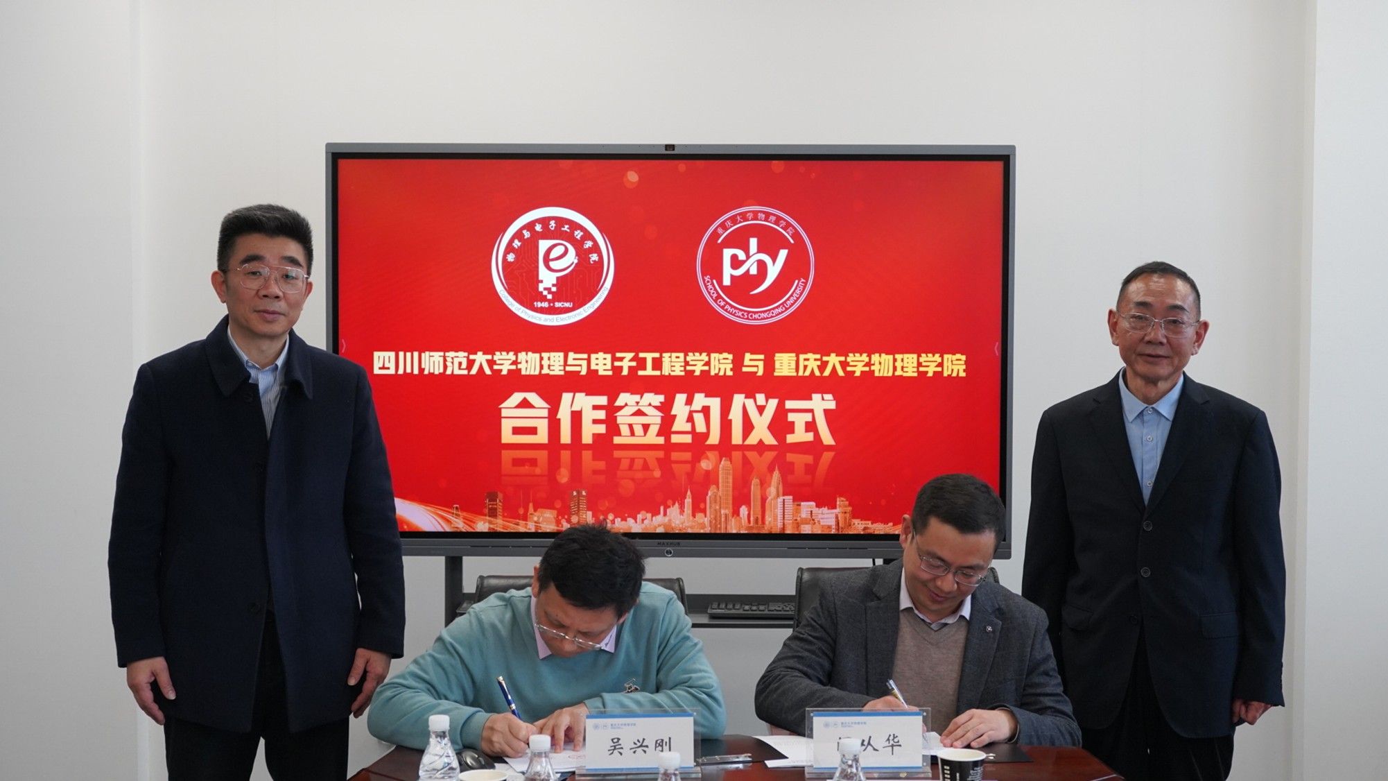 院长吴兴刚与四川师范大学物理与电子工程学院副院长闫从华正式签署战略合作协议,并合影留恋,标志着两校合作步入崭新阶段。此次签约不仅预示着双方在物理学科建设上的深度合作,更彰显了双方致力于服务国家战略需求,携手共进,为国家科技创新体系贡献力量的决心与行动。