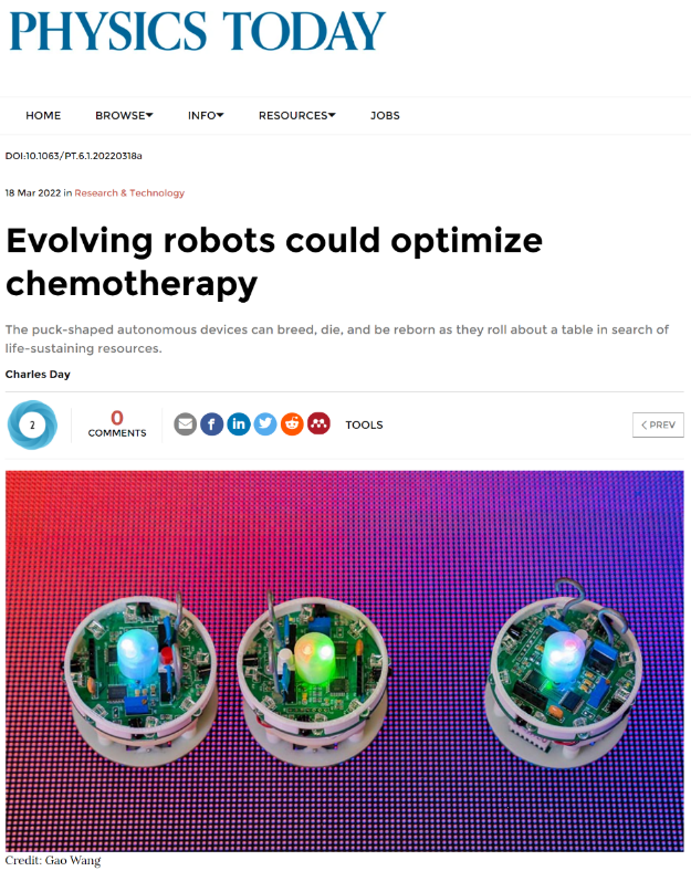 Charles Day, editor-in-chief of Physics Today, a journal of the American Institute of Physics (AIP), wrote a special article discussing the cluster robot system and the inspiration for biology. The report suggests that the study's findings are extremely enlightening for therapies in cancer chemotherapy approaches, namely that random doses of multiple drugs have the potential to suppress cancer cells with high mutation rates better than time-dosing chemotherapy doses.