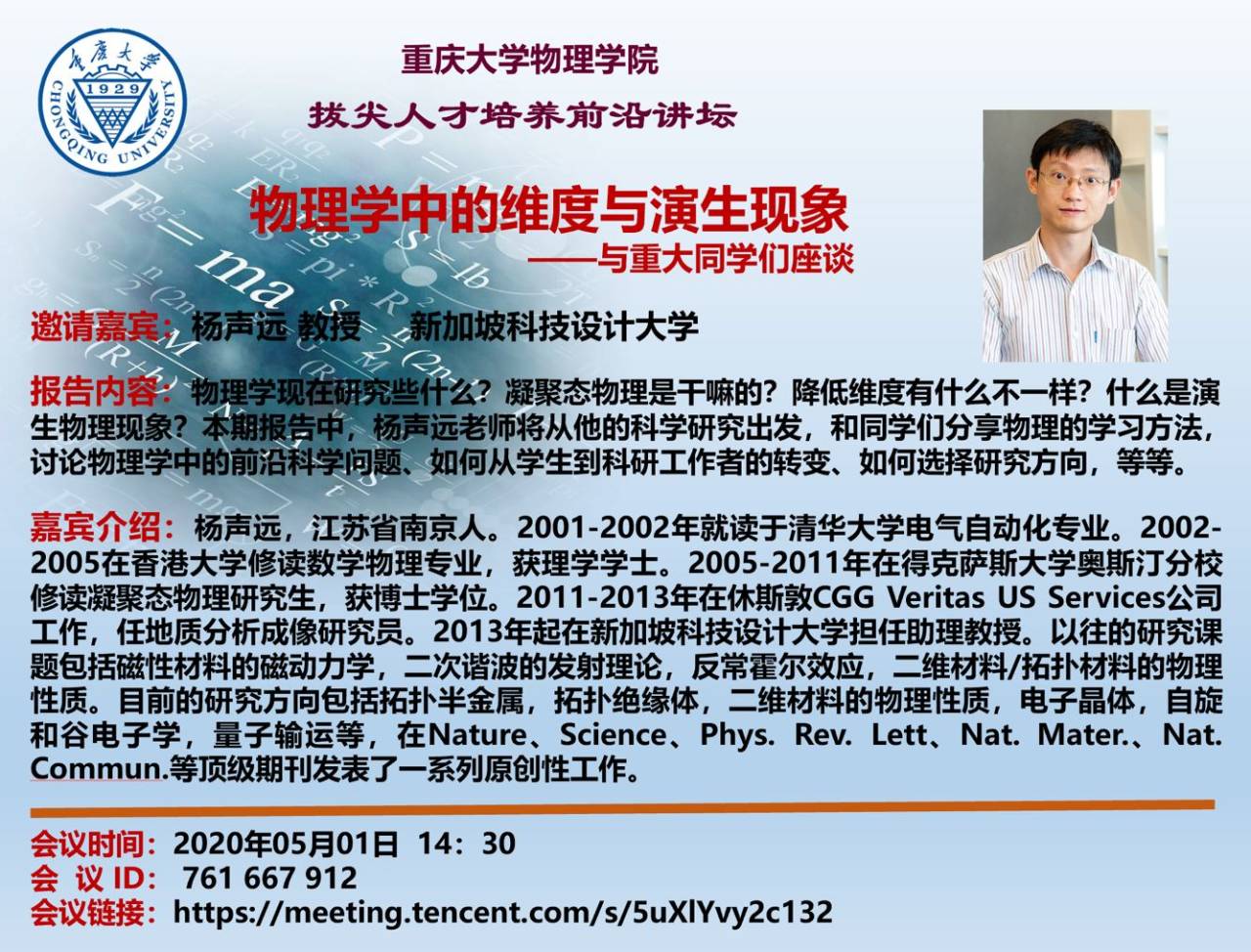 6. 2020年05月01日,邀请新加坡科技设计大学杨声远教授作“钱三强英才班”前沿讲坛讲座——物理学中的维度与衍生现象;