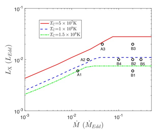 图二:光度—吸积率图上的不稳定边界(右下方稳定,左上方不稳定),三条曲线分别代表三个不同的辐射温度。