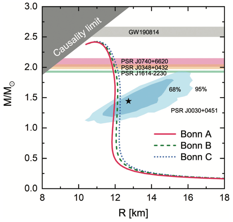 图1. 基于真实核力Bonn A, B, C, 完备Dirac空间中的RBHF理论预言的中子星质量-半径关系。水平阴影带表示大质量中子星的天文观测,深蓝和浅蓝阴影区域分别表示NICER团队分析中子星PSR J0030+0451数据给出的质量和半径的和联合置信区间,上方水平灰色阴影区域表示引力波信号GW190814的次级致密天体的质量范围,左上角灰色阴影区域表示因果律极限。