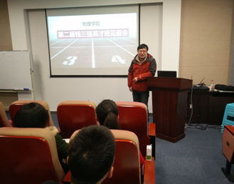 随后,第一届英才班班长王文成学长与大家进行了交流,针对大家今后的研究方向学长给出了自己的建议,建议大家可以关注新闻时事,逐步培养对于物理的兴趣,展示了英才班同学的竞赛成绩、班级的奖励制度等,并希望大家在第二届英才班中学习到更多的知识,结交更多的朋友。
