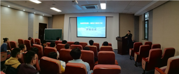 仪式伊始,萧老师首先代表学院祝贺同学们通过考核加入到学院首届英才班,本届英才班是在我校建设双一流大学之际,也是实行人才培养新计划的背景下,与中科院高能所共同成立的,学院对英才班的同学提出了更高的要求,希望同学们在英才班里勤奋学习,积极创新,成长为能适应和驾驭未来的人才。萧老师还介绍了与英才班协议的支持内容,比如奖学金、科研训练等问题。在与会人员的掌声中,第一届英才班宣布开班,李昕任班主任,王瑶任副班主任。