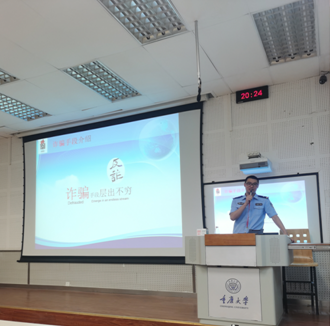 全体学生作防诈骗专题讲座。2021年6月6日晚,“全民共反诈,钟sir捎个话”系列讲座-新型网络诈骗及有效防范在虎溪校区D1237顺利举行,出席此次讲座的有司机社