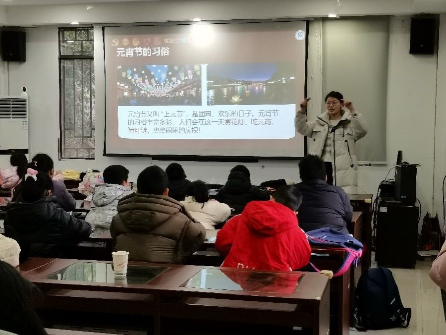 实践团从西汉燃灯祭祀的起源、唐宋时期赏灯游园的盛况讲起,到象征团圆的元宵美食和舞龙舞狮的喜庆场景,生动的讲解让孩子们听得入神。现场互动频繁,孩子们积极提问,对传统故事表现出浓厚兴趣。