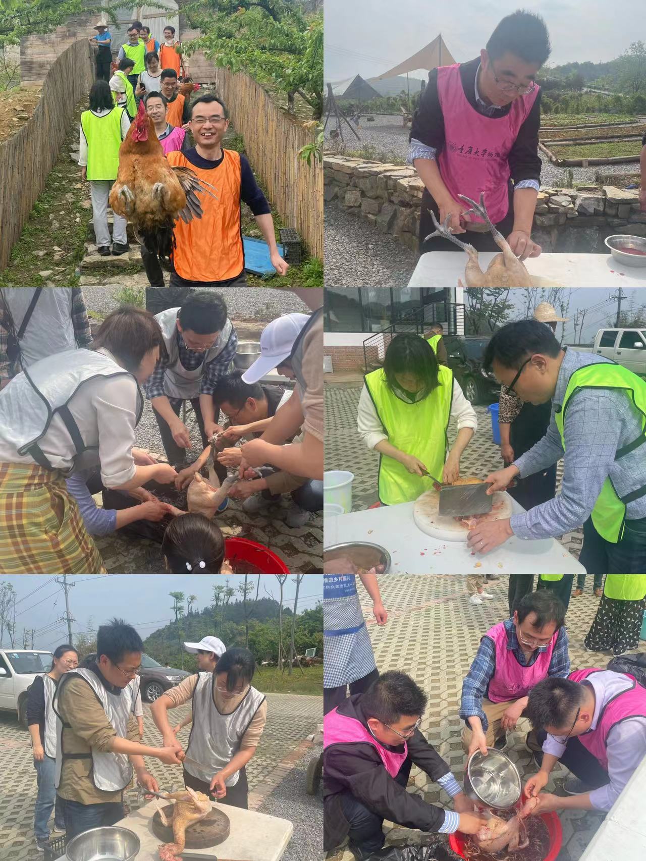 老师们热情高涨,主持人一声令下,各组“家庭成员”蜂拥冲进李子林中捉鸡,鸡被吓得四处乱窜,老师们穷追不舍、你抱我扑、合力围堵。一时间,鸡咯咯的叫声和老师们的欢笑声响彻树林,甚至盖过了裁判的喇叭声。接下来老师们有序分工,有的杀鸡、有的除毛、有的砍块。准备就绪后“大厨们”迫不及待大显身手,一口大锅、一捆柴,生火、炒料、下食材。不一会儿,柴火香萦绕,土鸡香扑鼻。