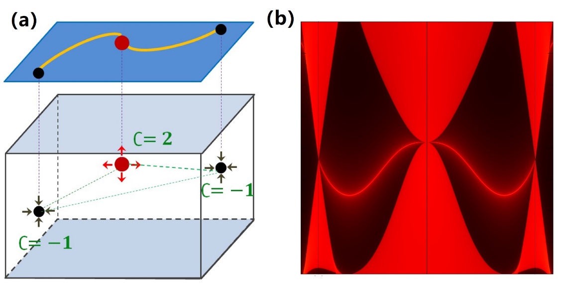 在该工作中,王锐与合作者首先根据有效模型和对称性分析提出Triangular Weyl Complex广泛存在于六角对称或者三角对称且具有时间反演对称性的材料中。Triangular Weyl Complex由三个Weyl点组成,这与传统Weyl系统中成对出现的Weyl点完全不同。进一步通过第一性晶格动力学计算,并在著名材料α-SiO2实现了该对称保护的拓扑物态。Triangular Weyl complex表现出独特的拓扑表面态:表面弧终结于一个double Weyl点和两个single Weyl点的投影。α-SiO2的晶格动力学性质广泛被理论和实验研究,有望进一步实验实现。因此,该工作将对拓扑新物态的探索和现实应用产生积极影响。