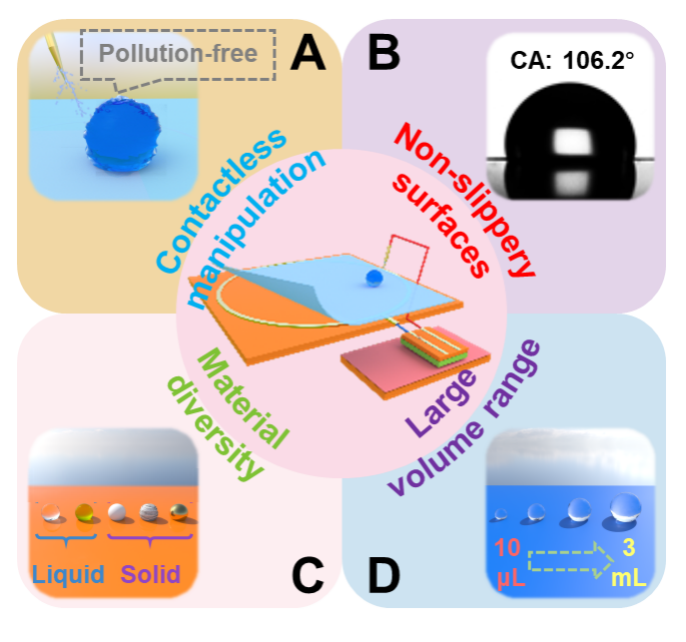 图示:基于TCCI技术的液滴操纵系统:A)非接触、无污染的操纵方式;B)非疏水表面的操纵条件;C)操纵目标的多样性(从液体到固体);D)大体积、动量的液滴范围。