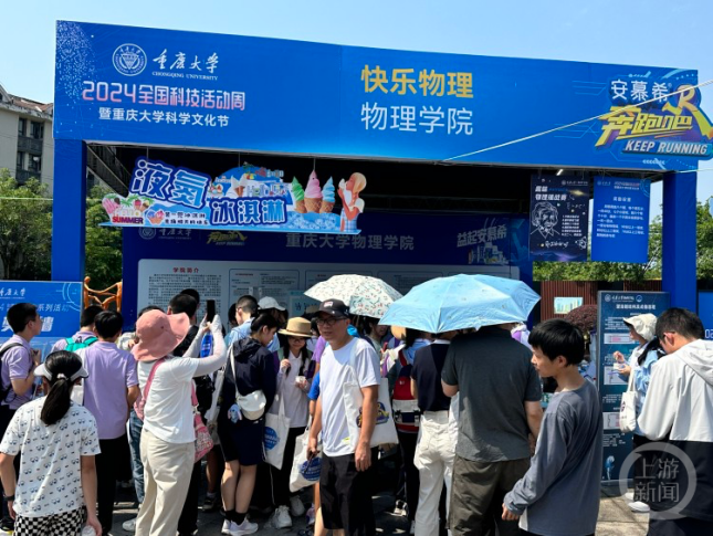 在38度的高温下,液氮冰激凌毫无悬念地成为全场最受喜欢项目。学院低温物理实验室何明全教授科研团队利用液氮沸点低的特点,将液氮加入酸奶和冰激凌粉混合的原料中,液氮迅速蒸发并吸收大量的热,使原料的温度快速降低形成冰晶,制作出的冰激凌不仅美味可口,而且操作简单、原料简单,大大提高了制作效率,为冰激凌的制作提供了新方法。