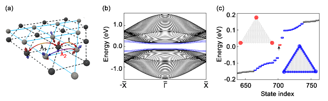 图1:最小晶格模型预测。(a)双层三角晶格的耦合机制、(b)一维纳米带能带结构和(c)三角纳米盘的能量本征谱。