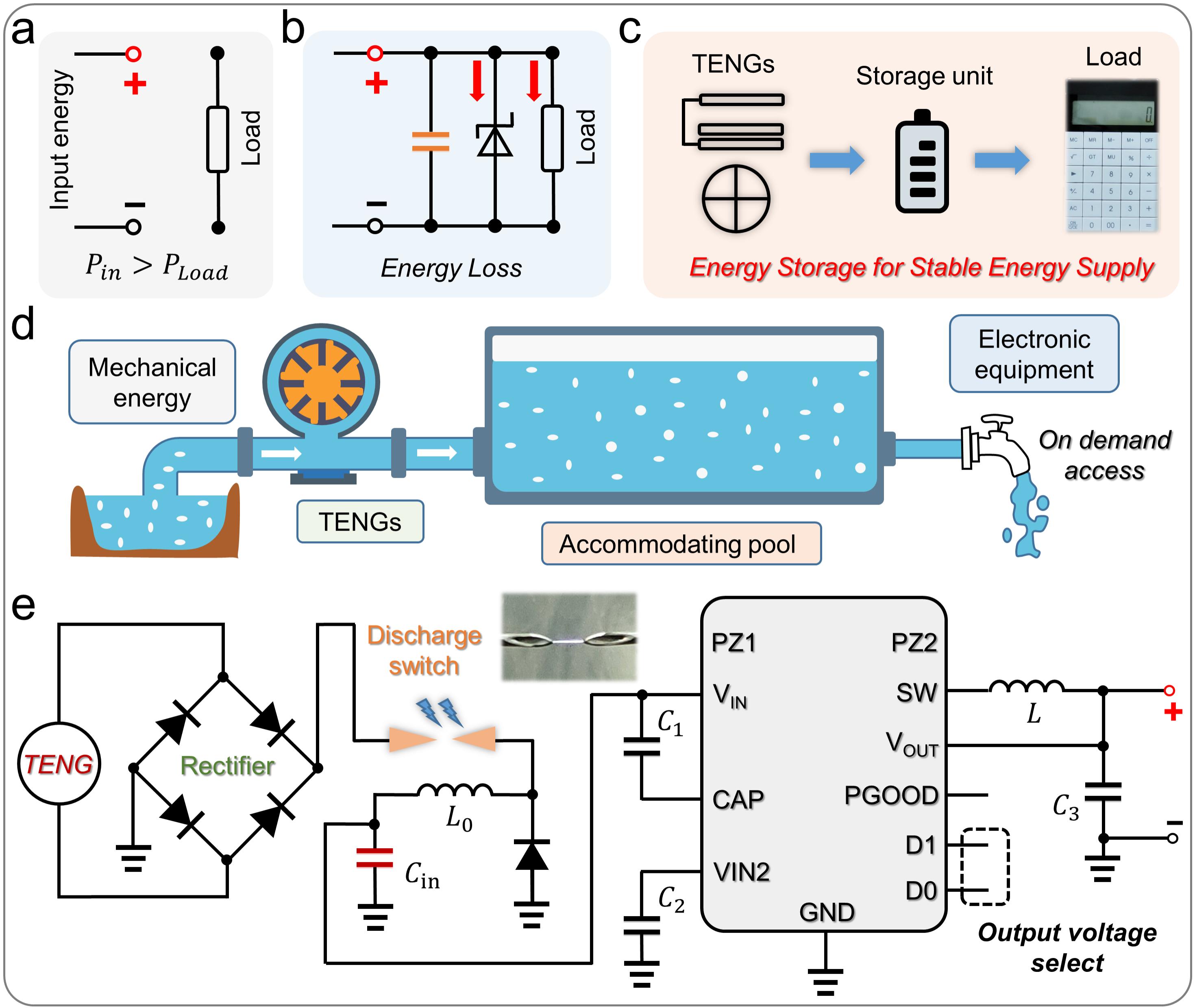 近年来,多种新能源技术取得了显著进步,为解决全球能源安全和环境问题提供了新的契机。其中,基于材料之间的摩擦生电以及静电感应效应的摩擦纳米发电机(TENGs),因其能够将环境中的低频机械能高效转化为电能的潜在优势,引起了广泛关注。然而,由于TENGs具有高内阻(兆欧至G欧),在直接为后端电子设备(等效阻抗通常为千欧级别)供电时,能量利用效率极低。研究人员通过包括变压器、开关电容、Buck转换器等多种能量管理策略,尝试提高TENGs的电能输出效率,但实际应用中仍存在能量利用效率低、输出规整方案欠缺等问题。