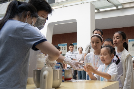 本届公众科学日最引人注目的是一系列互动体验项目。学院低温物理实验室何明全教授科研团队将-196℃的液氮倒入酸奶与冰淇淋粉的混合物中,瞬间白雾缭绕,宛如仙境。小朋友们一边惊叹于液氮倾泻时腾起的云雾,一边争相品尝现场制作的“星际冰淇淋”,在舌尖触碰到冰凉绵密口感的刹那,也真切体会到低温物理的神奇魔力。