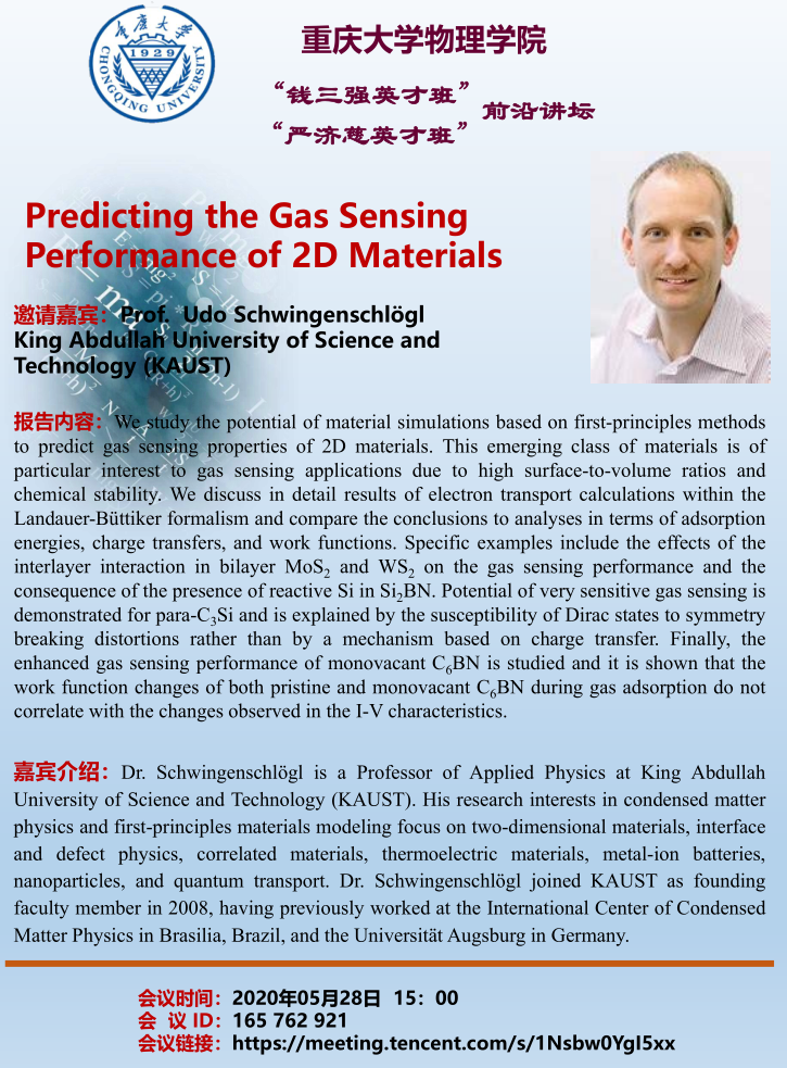 8. 2020年05月28日,邀请沙特国王科技大学Udo教授作“钱三强英才班”前沿讲坛——Predicting the gas sensing performance of 2D materials;